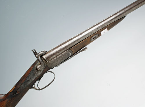 A 16-BORE PINFIRE DOUBLE BARRELLED SPORTING GUN SIGNED 'JOSEPH LANG, serial no. 2248 circa 1868, with twist steel 29 3/4in barrels, scroll engraved top-tang and 'Lang's Patent' underlever action, border and scroll back-action locks with the makers name incorporated in a banner, dolphin head hammers en-suite with the locks, chequered 14 1/4in. stock, (inlet repair to wood at end of top tang, crack behind right lock), silver vacant oval escutcheon to underside of stock, scroll and border engraved trigger guard tang and bow, chequered walnut forend wood with sliding key fastener (front trigger blade missing, the whole worn throughout)