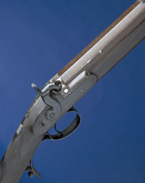 circa 1850, with browned, twist steel octagonal, sighted barrel, the top-flat engraved 'WILLIAM MOORE 78 EDGEWARE ROAD LONDON', fine bead dovetailed foresight and one standing, one folding leaf rear sight, platinum lined and vented breech plug, scroll engraved tang, flat, border engraved lock signed 'WILLIAM MOORE' and engraved with a slain stag surrounded by scrolls, sliding safety, scroll engraved hammer, figured walnut half-stock, finely chequered at the wrist, raised oval cheek-piece on the left hand side, silver rectangular escutcheon to the top of the wrist with the legend 'FOLLOW ME' within a garter, steel heelplate with scroll and bolting stag within a floral border engraved on the bow, provision for sling swivel forwards of the trigger guard and on the front ramrod pipe (swivels missing), and substantial horn-tipped wooden ramrod