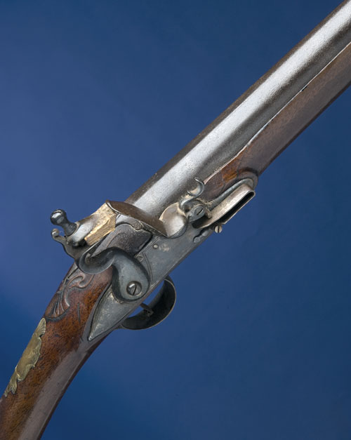 circa 1770, with 54in octagonal to round barrel, swamped at the muzzle with raised foresight (worn), makers mark of 'IH' in an oval at breech end, plain military style border-lined lock (details erased), walnut 'handrail' type full-stock (forend wood replaced), shell carved around the tang, brass furniture including fancy escutcheon to the wrist and fancy pierced side plate, four iron take-down wedges and five ramrod thimbles including throat (ramrod missing, iron parts discoloured)