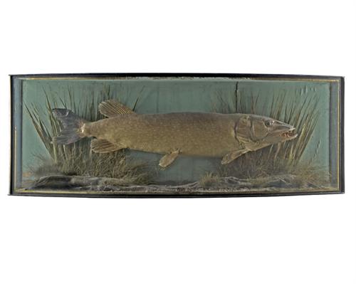 46 x 16 x 9in. with gilt-lined front panel inscribed 'Pike 17lbs 7 1/2oz caught at East Ville by J. Lunn Novbr. 12th 1922', the fish set amongst its naturalistic habitat and the case with two suspension rings.