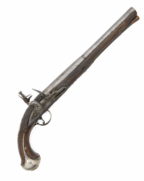 A 16-BORE SILVER-MOUNTED FLINTLOCK HOLSTER PISTOL SIGNED HEALY