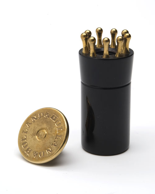 brass peg type placefinders numbered one to nine, housed in a brass and plastic holder in the shape of a cartridge, the brass lid marked Holland & Holland unscrewing to reveal the pegs
