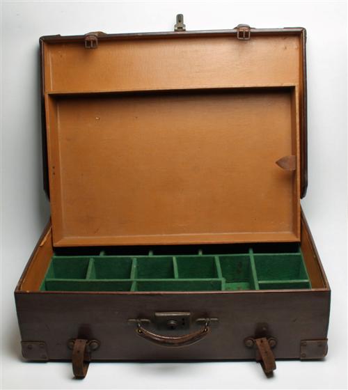 A LARGE VINTAGE TWO-TIERED LEATHER FISHING TRUNK, with a lift out try and boxing Estimate £150-250