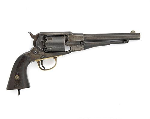 circa 1864, with refinished 6 1/2in octagonal sighted barrel signed 'E REMINGTON AND SONS. ILION NEW YORK USA' together with patent date (faint), refinished cylinder and frame, brass trigger-guard and wood grips and lanyard ring to bottom grip-strap
