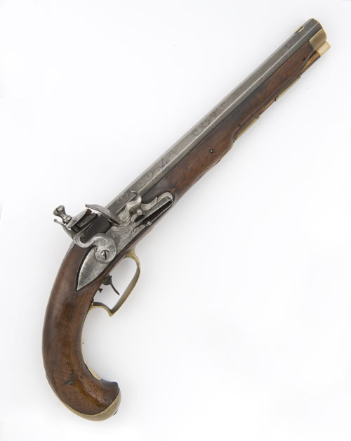 circa 1790, with octagonal, sighted 10in barrel, dovetailed nickel-silver blade foresight, twin leaf folding rearsight, silver inlaid on the top-flat 'FRANZ NICKELSARZ' together with loose scrolls, number '2' engraved to tang, slightly curved, radiused plain lock, walnut full-stock with tightly curved butt, brass tailed butt-cap, fancy brass side-plate, brass square-backed trigger guard, single set trigger, brass ramrod pipe and throat, horn forend cap, replacement bone-tipped rammer (iron surfaces bright)