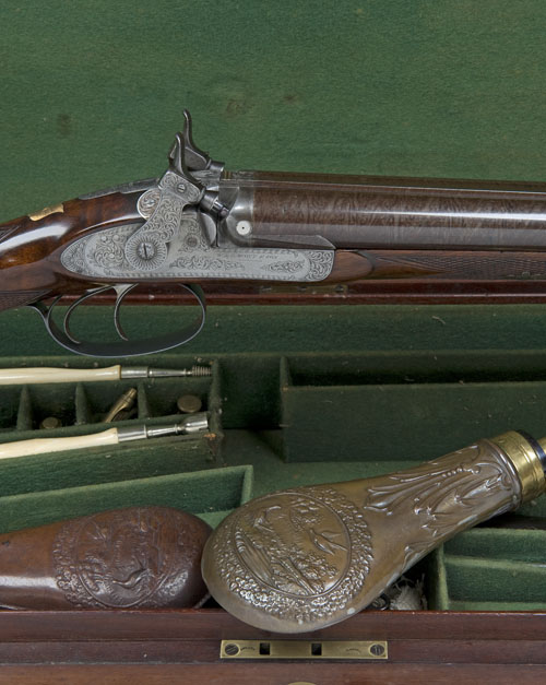 circa 1840, possibly converted from flintlock, with re-browned 30in barrels, the top-rib signed 'W & C SCOTT & SON, 7 DORSET PLACE, PALL MALL EAST, LONDON. BEST LAMINATED STEEL', scroll engraved and gold lined breech with platinum plugs, later common pattern nipples, scroll and shell engraved top-tang with additional scroll engraved tang-plates, flat, slightly curved locks with fancy border and scroll engraving, signed 'W & C SCOTT & SON', finely scroll engraved hammers with sunbursts around the spindle screws, 'Smith's' type removable hammer-noses, figured walnut chequered half-stock, blued, engraved steel furniture, original nickel-silver mounted ramrod (re-finished throughout, locks brushed bright) TOGETHER WITH a fine period mahogany guncase, compartmented and lined in green baize with a full compliment of accessories including an unusual brass nipple-pricker, a ivory mounted tool for removing 'Smith's' type nipples, two flasks and a capper