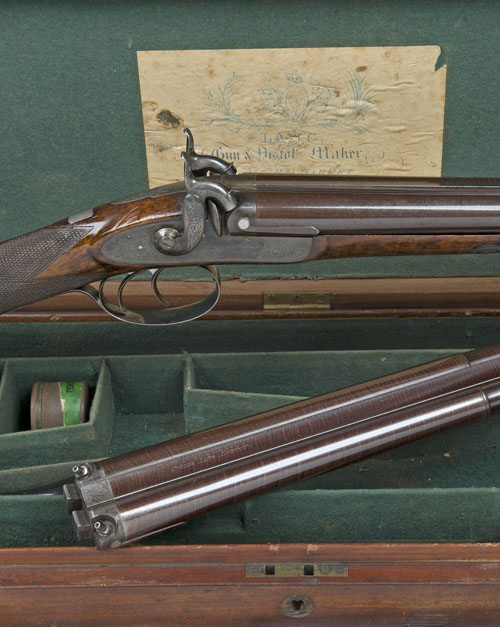 circa 1840, possibly converted from flintlock, with shortened re-browned twist-steel 19in barrels, the top-rib signed 'JOSEPH LANG, LONDON', (re-engraved) scroll engraved and platinum lined breech with platinum plugs, scroll and shell engraved top-tang, flat, slightly curved locks with fancy border and scroll engraving, signed 'JOSEPH LANG', walnut half-stock chequered at the wrist, blued, engraved steel furniture (worn), original, shortened brass-mounted ramrod (re-finished throughout, locks re-coloured) TOGETHER WITH a pair of 16-bore fine damascus barrels, serial number 784, signed on the rib 'JOHN DICKSON & SON, 63 PRINCES STREET EDINBURGH' and a period mahogany guncase, compartmented for both sets of barrels and lined in green baize with an original 'Joseph Lang' trade label to lid and a small assortment of accessories.
