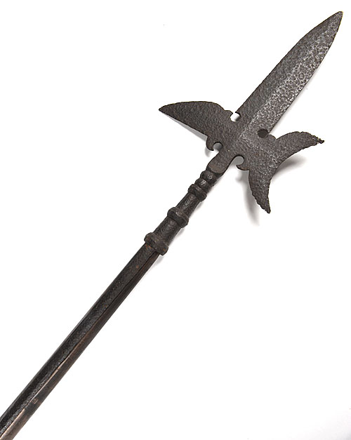 probably Spanish, with a crescentic cutting edge backed with an armour-piercing blade and topped with a wide, double-edged spear-point, the whole in excavated condition (some losses to definition) with long tangs and iron ring reinforcement, fitted to a later shaft
