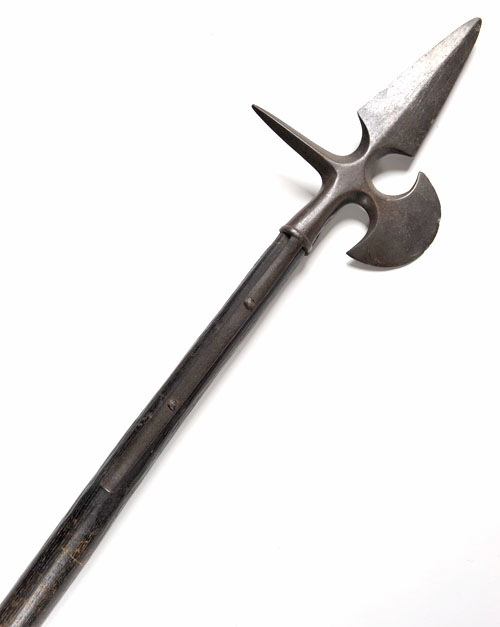 probably French, with a square-section armour-piercing spike backed with a crescent bladed axe and topped with a wide spear-point, long shaft tangs and later wooden shaft (head cracked in the socket)