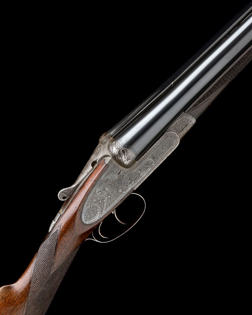 28in. sleeved nitro barrels, the rib matted at the breech, 2 1/2in. chambers, bored approx. 3/4 choke in both, side-clipped treble-grip action with hidden third bite, the fences carved with foliate motifs on a scrolled background, removable striker discs, pierced toplever, automatic safety with gold-inlaid 'S' detail, border and acanthus scroll engraving interspersed with vignettes of game birds, 14 1/2in. replacement stock, fore-end with some insert repairs, weight 7lb. 11oz.
