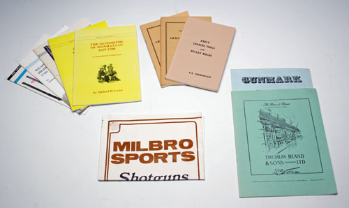Historical Arms Series No. 29 'Canadian Gunsmiths form 1608 A checklist of Tradesman by John A. Belton, Historical Arm Series No. 23 Scottish Firearms by Claude Blair & Robert Woosnam-Savage, Historical Arms Series No. 33 Weapons of the Highland Regiments by Anthony D. Darling, Historical Arms Series No. 14 The Gunsmiths of Canada by S. James Gooding, catalogue of 'The House Of Bland' Thomas Bland & Sons Gunmakers, Gunmark Price list October 1975, Milbro Sports 'Shotguns Rifles & Pistols