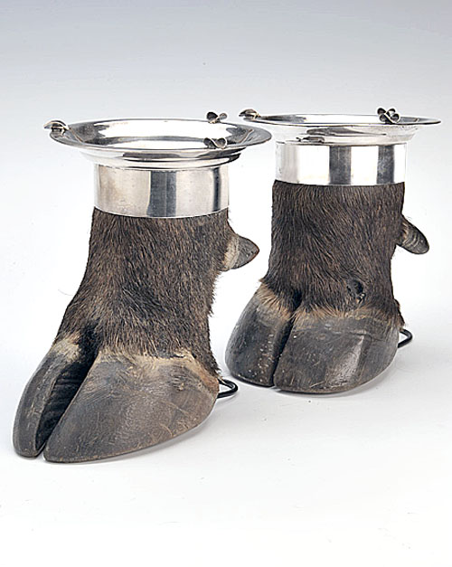 A PAIR OF BUFFALO FEET SURMOUNTED WITH SILVER FINISHED ASHTRAY