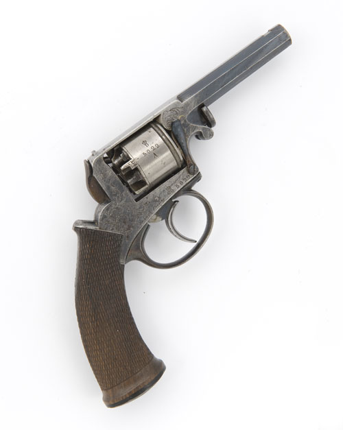 circa 1855, with blued 3in octagonal barrel (front sight missing), top-strap signed 'MANUFD. BY C.D. DULY & LEGALLY LICENCED' hinged side rammer, blued, scroll engraved and line bordered frame marked 'ADAM'S PATENT 1851' and the makers mark of a crown over 'CD', unfluted cylinder with rope-bordered leading edge, external hammer safety spring, one-piece finely chequered walnut grip and shell-carved butt-cap, the whole retaining a good percentage of original finish, Belgian proofs