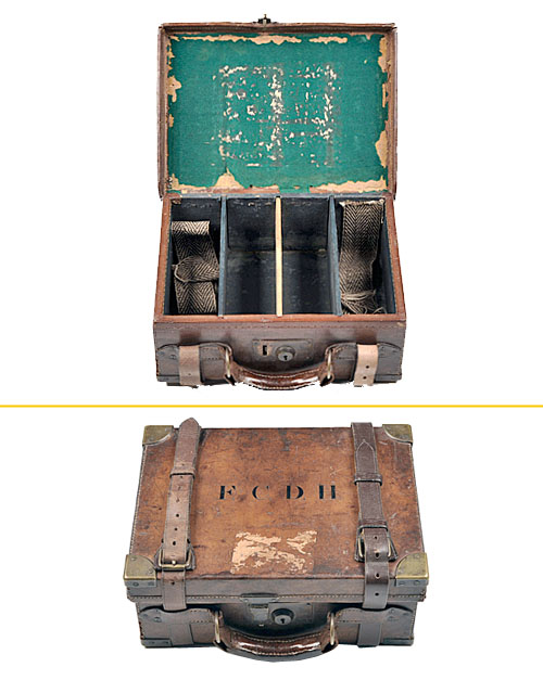 for approx. 200 cartridges, five compartments, dividers, lifters missing, brass lock (key missing), needs attention, with the monogram F.C.D.H. on outer lid.