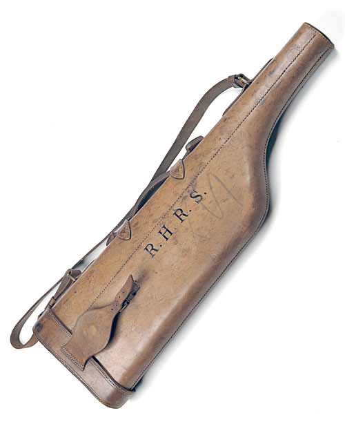 fitted for 28in. barrels, brass lock (key missing), strap, handle, internal flap and lid all good, carrying the monogram R.H.R.S