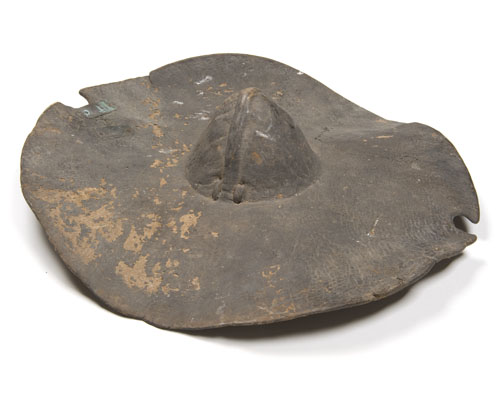 mid to late 19th century, with raised conical 'umbo' to the center reinforced with covered iron bars, wooden handle and leather straps to reverse, approximately 23in. in diameter (some loss to hide surface, old copper and iron repairs to edges)