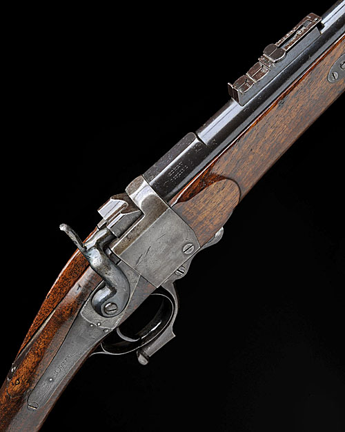 circa 1880, with blued 27in. 'Henry' rifled round barrel signed 'A. HENRY, EDINBURGH', block and blade front-sight, two folding, one standing leaf rearsight with additional adjustable ladder sight, left hand side of barrel with calibre designation, top of breech-block marked 'PATENT No 2063', plain action body signed 'HENRY'S PATENT' on the left hand side, separate stepped unbolted plain lock signed 'A. HENRY', plain hammer, figured straight-hand unchequered walnut stock (old crack and repair to wrist behind lock), steel heel-plate, under-lever with 'Henry's' catch and plain unchequered walnut splinter forend with cross-bolt fastener (traces of colour throughout)