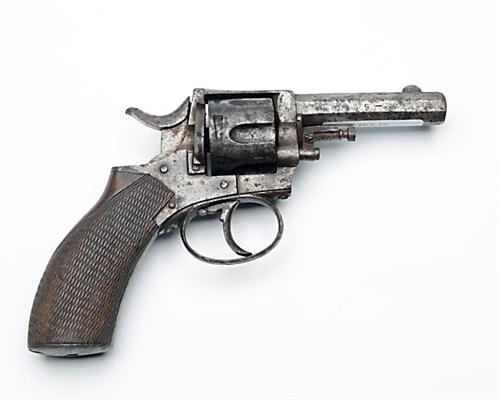 * A .380 SIX-SHOT REVOLVER SIGNED JOSEPH BOURNE, MODEL 'WEBLEY TYPE', serial no. G9, circa 1900, with octagonal 3in. barrel (re-numbered), the top-strap signed 'JOSEPH BOURNE & SON BIRMINGHAM', fluted cylinder, solid stepped frame with side loading gate, chequered one-piece walnut grip with iron butt-cap, no finish