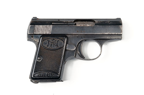 ** A 6.35MM (25 ACP) SEMI-AUTOMATIC POCKET PISTOL SIGNED FN BROWNING ,MODEL "BABY"serial no 178561 with 2in barrel blued slide with matted sighting rib and iron frame all retaining a fair amount of original blue with factory black plastic chequered grips with FN monogram and "Baby" to base.