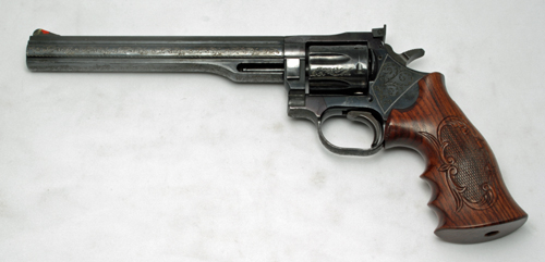 ** A .357 (MAG) SIX-SHOT DOUBLE-ACTION REVOLVER WITH THREE SPARE BARRELS SIGNED 'DAN WESSON', MODEL 'DELUXE', serial no. 93459, with interchangeable 2in., 4in., 6in., and 8in. barrels, the shrouds on all except the 2in. example engraved with vines and foliage, blued fluted cylinder and frame engraved en-suite the whole ensemble with four interchangeable wooden grip styles, proved 2011