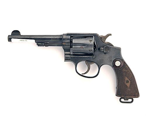 ** A .38(S&W) SIX-SHOT DOUBLE-ACTION REVOLVER SIGNED SMITH & WESSON, MODEL 'M & P', serial no. 784876, possible wartime production with 5in. sighted barrel, blued cylinder and frame, chequered walnut grips and lanyard ring, much original finish with some surface corrosion