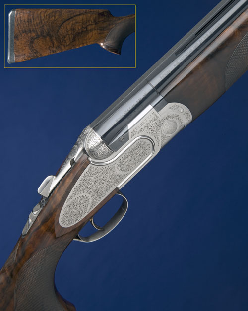 30in. 'Optima-Bore' nitro barrels with ventilated mid-rib and 9mm ventilated matt top-rib with intermediate bead, 3in. chambers, multichokes (with spares), hold-open toplever, manual safety with integral barrel selector switch, gold-washed adjustable single-trigger, engraved with acanthus scrollwork, 14 1/2in. figured pistolgrip stock including 3/4in. rubber recoil pad, weight 8lb. 4oz., in its makers leather case