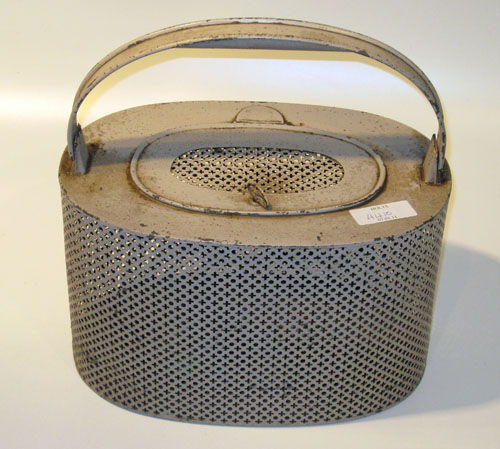 A DECORATIVE ANTIQUE METAL FRETWORK TROUT KEEP BASKET