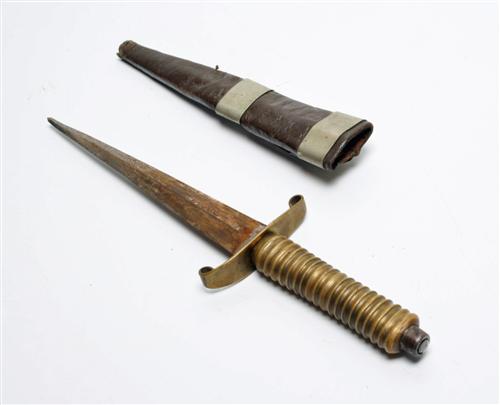 A STILETTO DAGGER, possibly Italian and used as a trench knife, with 6 1/2in. blade (tip bent), brass hilt and cross-guard and nickel-mounted leather scabbard (chape missing from scabbard, blade corroded)
