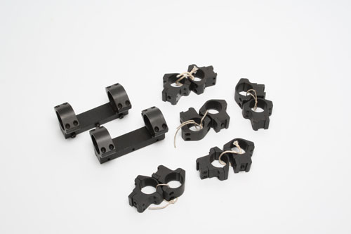 A BOX OF SEVEN SCOPE MOUNTS, all virtually new Estimate £30-50