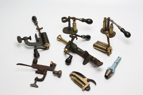A COLLECTION OF RE-LOADING TOOLS, including an 8 bore roll-over tool, 12 bore re-loading turn-over tool, a 12 bore priming/de-priming tool, a 12 bore capper/de-capper tool, a 12 bore roll over tool, 12 bore re-capper & expeller with side lever, 12 bore double barrel re-capper & cap ejector, 15mm wad cutter,