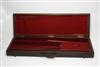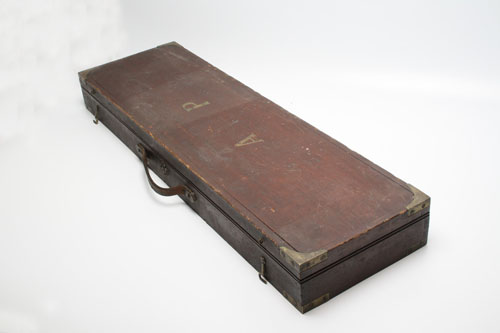 A WOODEN BRASS CORNERED GUNCASE, fitted for 31in. barrels, lined with maroon baize, outer lid with brass letters A. P.