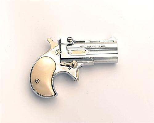 A 6.35mm (.25ACP) OVER-UNDER DERRINGER PISTOL SIGNED DAVIS, MODEL D25, serial no. 014293, recent, with chrome-plated 2 3/8in. barrels, single-action mechanism and imitation mother-of-pearl grips, appearing unfired in its makers carton