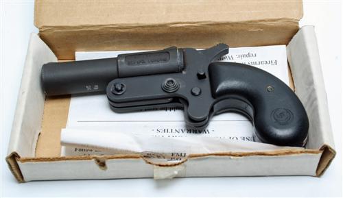A .45 (COLT) / .410 SINGLE-BARRELLED DERRINGER PISTOL SIGNED FMJ, MODEL 'D' serial no. A00053076 with dual-calibre 3 1/2in semi-rifled barrel and bag-shaped butt with plastic grips, appearing unfired in its makers carton