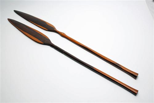 TWO AFRICAN EXOTIC HARDWOOD DECORATIVE SPEARS, each measuring approximately 38in. overall Estimate £25-35