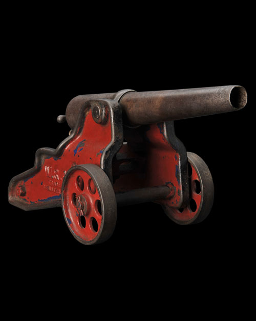 circa 1903, with 12in. plain taper barrel of the rare thin muzzle variety signed with the Winchester address (feint), hinged breech, heavy cast iron two wheeled trolley with 'W. R. A. CO TRADE MARK REGISTERED IN US' in raised letters on the side panels, the trolley with later red paint, muzzle pitted to outside.