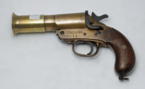 A 1in. SINGLE-SHOT SIGNAL PISTOL, SIGNED 'WEBLEY & SCOTT', serial no. 58269, dated for 1917, with 5 1/2in. brass bell-mouthed barrel (proved 2011), brass frame and smooth walnut grips