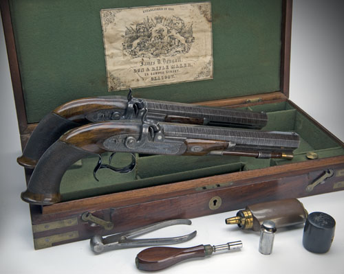 circa 1845, with re-browned micro-rifled octagonal 9 1/2in. sighted barrels, the top-flat signed 'J. D. DOUGALL, ARGYLE ARCADE, GLASGOW', border and scroll engraved colour-hardened breeches and tangs, border and scroll engraved colour-hardened bar-action locks signed 'J. D. DOUGALL', sliding safetys behind the hammers, walnut half-stocks with chequered grips and flat based flared butts, blued steel spurred trigger-guards, silver take-down wedge escutcheons and forend tips and under-barrel ribs with original ramrods, both pistols with much original finish except barrels, TOGETHER WITH their original brass re-inforced mahogany, compartmented case lined in green baize (reproduction label for the Gordon Street address) and complete with a number of contemporary, possibly original accessories including a three-way copper-bodied powder-flask, scissors ball-mould, oil bottle and nipple key, the lid of the case with a brass ring handle (some compartments loose)