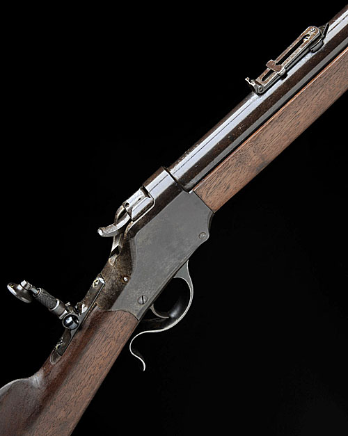 for 1887, with round, taper 30in. barrel signed 'MANUFACTURED BY THE WINCHESTER REPEATING ARMS CO NEW HAVEN CONN USA, nickel-beaded front-sight, 1876 pattern ladder rear-sight, peep-sight fitted to top tang, plain receiver, plain walnut butt-stock with chequered iron heel-plate and splinter forend with ebony inlay at tip (iron surfaces re-blacked, woodwork refinished, possibly replaced)