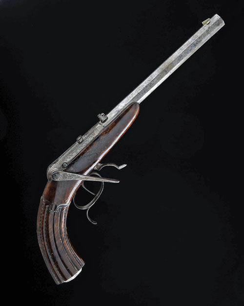 circa 1855, with 9in. octagonal rifled barrel, nickel bladed fore-sight, micro-adjustable rear-sight, the top-flat of barrel inlaid in silver 'EREINDUNG V. C. I. DOERSCH IN LUXEMBURG', border and scroll engraved panels to top and sides of breech, lever for opening action on right hand side, walnut half-stock with fluted grip (broken through and repaired at action), iron butt-cap, spurred iron trigger-guard, set trigger and cocking lever at front of trigger-guard (cleaned and stained throughout)
