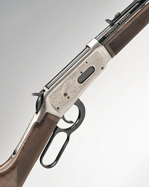 WINCHESTER .30-30 WIN. ' MODEL 94 LEGENDARY LAWMEN' LEVER-ACTION REPEATING RIFLE, serial no. LL13057, nitro reproved in 2010, nickel finish action with border and scroll engraving surrounding Western scenes of mounted Marshalls, the stock inset on the right with a medallion with a Marshall's star and an image of a Lawman about to draw