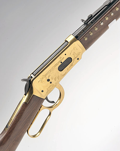 WINCHESTER .30-30 WIN. 'MODEL 94 SIOUX CARBINE' LEVER-ACTION REPEATING RIFLE, serial no. SUO7967, nitro reproved in 2010, brass studded woodwork with a medallion to the right side of the stock, gold-coloured action engraved with representations of Sioux Indians and artifacts