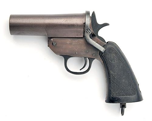 A 1in. SINGLE-SHOT SIGNAL PISTOL, SIGNED 'HARRINGTON & RICHARDSON', MODEL 'MKV', serial no. 274, circa World War Two, with 4 1/4in steel barrel, steel frame, black plastic chequered grip, the whole retaining nearly all its original anodised finish