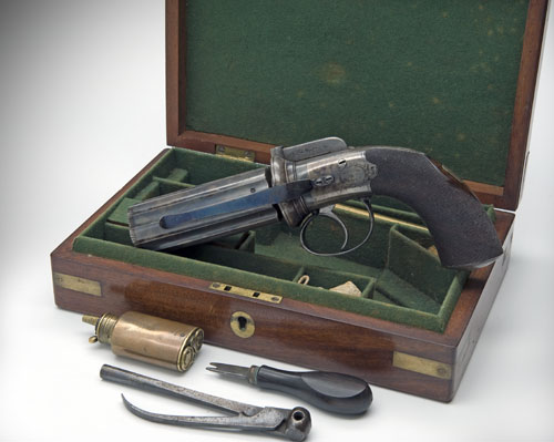 circa 1845, with 4 1/2in. case-hardened fluted barrel-block engraved with a band of foliage at the muzzles and numbered '1' to '6' at the breech-end, case-hardened border and scroll engraved action signed 'GOUGH & BOWEN', case-hardened scroll engraved central bar-hammer, finely chequered walnut butt, case-hardened butt-cap with hinged trap-cover engraved with foliage, silver escutcheon to rear of grip, blued border and scroll engraved trigger-guard, blued iron belt-hook, and much original finish throughout, Birmingham proof marks, in original fitted brass-cornered mahogany case lined in green baize with accessories including iron pincer-type bullet mould with one stem forming a ramrod, J.D. & S. brass-mounted copper three-way pistol-flask and brass ramrod, the exterior with shaped brass escutcheon.