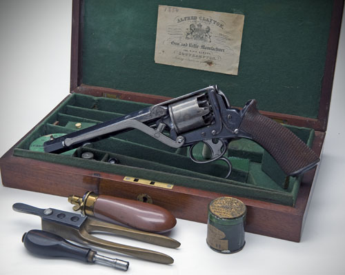 circa 1855, with 6 1/4in. blued octagonal sighted barrel engraved at the muzzle, scroll engraved breech end, border and scroll engraved blued top-strap signed 'A. CLAYTON, SOUTHAMPTON', border engraved colour-hardened cylinder, border and scroll engraved blued frame, bright triggers and detachable patent rammer, chequered walnut butt, blued scroll engraved trigger-guard and colour-hardened pommel, the whole retaining much original finish, London proof marks, TOGETHER WITH its original fitted mahogany case lined in green baize, original 'Alfred Clayton' makers label to the inside of lid, and a full compliment of accessories including a Dixon pistol-flask, 54-bore brass bullet mould marked 'TRANTER'S PATENT', brass-mounted cleaning rod with worm, a tin of Tranter's Lubricating Bullets and a tin of Eley's Metal Lined Caps , the exterior with circular brass escutcheon.