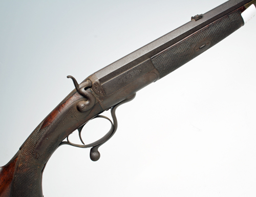 FREDc. T. BAKER .360 (ROOK) ROTARY-UNDERLEVER SINGLE-BARRELLED HAMMER ROOK RIFLE, serial no. 5920, 27 3/4in. octagonal barrel with open sights and two folding leaf sights, bead fore-sight, rotary-underlever, non-rebounding back-action lock with border and scroll engraving, the makers name and serial number, 14 1/4in. figured pistolgrip stock (cracked through and repaired at hand), fore-end with horn finial