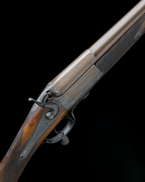 31 3/4in. bold damascus barrel, Jones patent rotary-underlever, carved fence, rebounding back-action lock, border and scroll engraving, 14 1/8in. stock including steel buttplate, fore-end with horn finial, weight 6lb. 12oz.