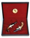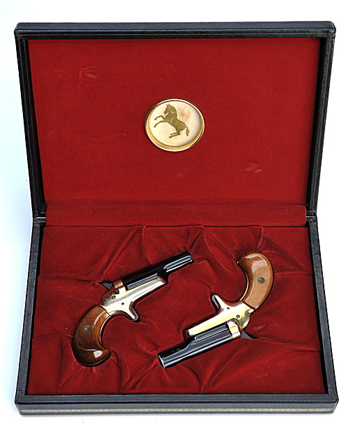 circa 1970, with 2 1/2in. black enamelled barrels (some loss to finish) signed 'COLT', silver gilt brass frames (gilding worn thin), walnut birds-head grips TOGETHER WITH their original black leatherette display box lined in red velvet, the inside of lid with inlaid celluloid 'Colt' medallion, the outside of lid depicting one of the pistols together with a gentleman in Victorian dress, The 'Colt' logo and the legend 'Lord Deringer'