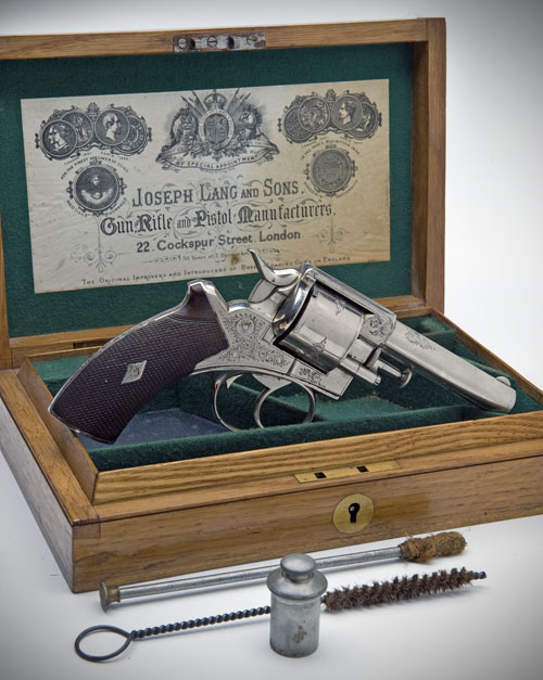 circa 1880, with 3 1/2in. ovoid barrel, crescent fore-sight, engraved foliate band to the muzzle, scroll engraved near breech, grooved, border and scroll engraved top-strap signed 'J. LANG & SONS, COCKSPUR ST. LONDON', plain cylinder with border-lined front edge, panels of scroll engraving and ratchet notches to the rear, scroll and border-lined frame together with 'WEBLEY'S PATENT' and the 'winged bullet' logo, chequered walnut grips with scroll-engraved back-strap and butt-cap, scroll engraved trigger-guard, extractor rod concealed within cylinder arbor, the whole remaining in good condition with only minor flaking on grip-straps, TOGETHER WITH its original English market oak case lined with green baize, 'Joseph Lang' trade label to the lid and containing an oil bottle and two cleaning rods