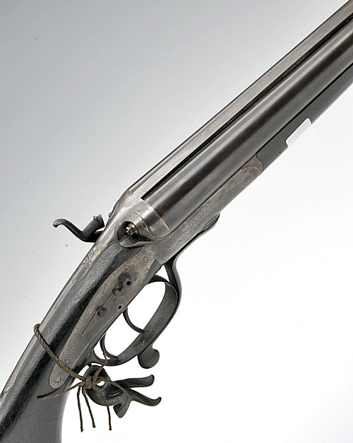 BLAND & SONS .577/.500 (NO.2 EXPRESS) BLACK POWDER EXPRESS ROTARY-UNDERLEVER DOUBLE HAMMER RIFLE, serial no. 13614, 28in. barrels, carved percussion fences, back-action locks with bolted hammers (right lock missing hammer, left lock with replacement, incorrect hammer), heavily cleaned overall, Bland & Sons appearing only on the inside of the lockplates
