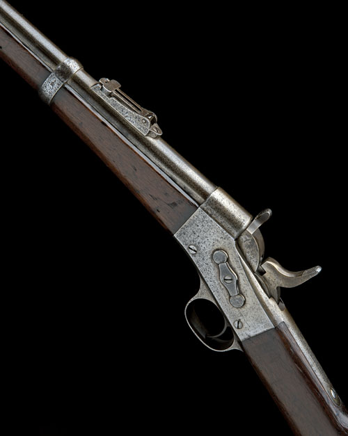 circa 1890, with 23 1/2in. shortened, sighted barrel, plain receiver, three-line address to top-tang (rubbed), straight-hand butt-stock with iron heel-plate, splinter three-quarter fore-end with two barrel-bands, complete with iron clearing rod